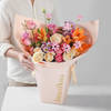 An abundant palette of warm hues defines this artisanal bouquet, crafted for moments that call for something special. Creamy peach and pink hues blend together seamlessly, creating a lush, voluminous display with a refined, modern edge. It is finished with whimsical accents of dried flowers making it an elegant choice for anniversaries and heartfelt gestures. - Total No. of Stems: 32 - Peach roses, Noblesse roses, Orange asiatic lily, Pink santini, Pink lisianthus, Dried pink daisy - Peach wrap, Interflora white ribbon - *This handtied will be delivered in Interflora beige bag* - Height: 58.5 cm / 23 inches - Width: 56 cm / 22 inches