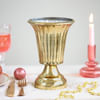 A golden chalice brims with holiday magic, cradling cypress leaves, pink-sprayed pinecones, and shimmering rose gold, red, and gold baubles. Twinkling pink and gold ribbons weave through reindeer and tree ornaments, while golden bead strings and a Santa hat whisper festive cheer. A radiant moment of Christmas wonder and enchantment.