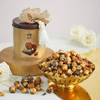 A celebration of opulence, this luxurious Bhai Dooj hamper brings together golden peonies, white roses, and spray carnations in a stunning arrangement wrapped in lace and pearls. Blending elegance with indulgence, it features decadent baklava, vegan pistachio bites, a wholesome nut mix, nutty popcorn, and fragrant tuberose jasmine delights. This thoughtfully curated creation is a perfect gift for Bhai Dooj, offering timeless beauty and a truly sensory celebration of love and togetherness.