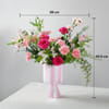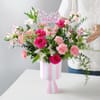 A poetic tribute to her grace, this arrangement pairs bold pink blooms paired with delicate greenery to create a warmth that feels both comforting and cherished in a stylish pinstripe vase. It's a rhythmic blend of texture and tone, designed to celebrate the beautiful 'ode' that is a mother's love. - Total No. of Stems:30 - Cerise Pink Rose, Pink Carnation, Pink Spray Carnation, Pink Alstroemeria, Eucalyptus - Love You Mom Tag - Pink & White Strip Vase, Metal - *This arrangement will be delivered in an Interflora Box. - Dimensions: - Height: 45.5 cm / 18 inches - Width: 38 cm / 15 inches