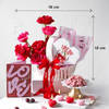 An indulgent basket styled in rich red and cerise pink tones with soft green accents. Presented in a charming boat-shaped basket with playful stripes and cherry detailing wrap, it's finished with a plush red velvet ribbon and a greeting card for an elevated gifting experience. - Total No. of Stems: 7 - Red roses and Cerise pink roses - Heart Box Packaging - Strawberry choco pretzels 30 gms - Heart-shaped scented candles x 4 - Love you so much Greeting Card - Boat-shaped Basket, Jute - Product Dimensions: - Height: 30 cm / 12 inches - Width: 40 cm / 16 inches