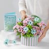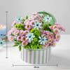 Tucked into a playful striped keepsake trunk and paired with a heartfelt birthday card, this curated gift is the perfect blend of modern style and festive cheer. - Total No. of Stems: 14 - Green button chrysanthemum, Pink santini, Dried blue daisy - Happy Birthday lase-cut greeting card - Pink and green striped trunk - Height: 27 cm / 10.5 inches - Width: 28 cm / 11 inches