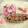 A hamper designed to celebrate every sweet moment. Light pink carnations, pink-sprayed dry peonies, and soft springery set a delicate tone. A trunk adorned with intricate modern kalamkari illustrations of peacocks and minars holds a turquoise rakhi set for bhaiya and bhabhi embellished with kundan and pearl accents with a roli chawal leaf plate. A floral blue canister offers black pepper cashews and roasted almonds, while rich Doda barfi completes these delectable rakhi delights, perfect for online rakhi delivery and thoughtful gifting.