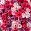 A breathtaking cascade of blush, fuchsia, and lavender blooms, this voluminous masterpiece offers a rich, layered expression of romance on a grand scale. Nestled within a tall pink marble-textured hatbox and accented with a playful 'Love' balloon, it stands as a dramatic showstopper for an unforgettable Valentine's surprise - Total No. of Stems: 200 - Purple roses, Sweet avalanche roses, Cerise pink roses