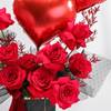 Captivate your partner's heart with a gift that speaks pure romance. A sleek black box bag overflows with lush red roses and red-sprayed limonium, creating a bold and elegant expression of love. Wrapped in fine black net and tied with a red suede ribbon, every detail reflects passion and care. Two red heart-shaped foil balloons, each 10 inches, rise above the arrangement to complete the look with a touch of playful charm. Perfect for anniversaries, it is a stunning gesture that turns your special day into an unforgettable memory.
