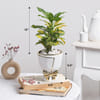 A Gold Star Croton plant, celebrated for its vivid green leaves speckled with golden accents, flourishes in a white vase adorned with an integrated golden bow. Resting on smooth white stones, this vibrant plant symbolizes prosperity, confidence, and joy. Presented in an Interflora luxury box, it is a radiant gift of lasting color and positive energy for any space.