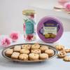 Here's an assortment that boasts thoughtful abundance. Laden with nature's delight of pink spray carnations and a pink kalanchoe plant, toothsome treats like lebanese baklava gift box, protein bars, buttery shortbread chocolate barks, salted and roasted almonds, black pepper cashews and vegan pistachio crunch bites, along with a floral-infused radiant tea box for beauty and health, it's an ode to the magnanimous spirit of your loved ones.