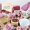 Pamper your loved ones with a thoughtfully curated hamper brimming with love and indulgence. This elegant tray includes Lindt Choco Wafers, Nutty Nibbles, a Pistachio Jar Cake, Masqa Chewy Crunch Bar, and a charming white mug with a pink bow. Adding sparkle is a floral CZ openable pendant perfectly delicate and graceful. All items are beautifully arranged in a reusable panel tray, adorned with pink roses, cymbidiums, white ribbons, and delicate lace ribbons. A heartwarming blend of taste, elegance, and sentiment to make their day truly unforgettable.