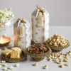 Steeped In Tradition, This Premium Diwali Gift Brings Together Soft Pink Carnations, White Tube Roses, Spray Chrysanthemums And Dried Peonies, Enhanced With Cascading Pearl Tassels And Strings. Two Block Gift Box Packagings Rest At The Centre, Framed By A Striking Gold Lotus Stand, Accompanied By Soan Papdi Bites And Date Burfi Along With Salted & Roasted Cashews. This Majestic Curation Is A Timeless Choice Accentuated By Pink Metal Diyas For Luxury Diwali Gifts, Blending Prosperity, Joy, And Togetherness.