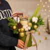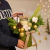 Warm, festive, and beautifully curated, this Christmas arrangement brings together the perfect blend of treats and seasonal charm. Set in a chic green cylindrical box, the display features a luscious butterscotch jar cake, classic coffee chocolate, and rich Madagascar dark chocolate for a delightful indulgence. Golden assorted balls, natural pine cones, fresh cypress, and two cotton dry flowers add a winter-inspired touch. Finished with a shimmering glitter ribbon, this arrangement makes a thoughtful gift or a stunning centrepiece for holiday celebrations.