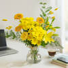 Golden as morning light and sweet as a drop of nectar, Honeydrop Petals is a sunlit composition of yellow roses, gerberas, and an Asiatic lily, softened with spray chrysanthemums, springeri, and feathery bunny tails. Styled in an hourglass vase with a gold tissue ribbon and presented in a luxury box, it lingers like the taste of something tender and honeyed.