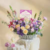 A graceful medley of blooms comes together as a luxurious celebration of colour and blessings. Oriental lilies, chrysanthemums, peach roses, carnations, and charming purple daisies unfold in perfect harmony. Fresh eucalyptus imparts a touch of gentle freshness, elevating the bouquet with its serene and uplifting essence. Each petal radiates warmth and beauty, making this exquisite floral creation a refined way to share joy, gratitude, and heartfelt wishes during Eid. - Total No. of Stems: 28 - Oriental Pink Lily, Mauve Spray Chrysanthemum, Peach & Deep Purple Rose, Purple Carnation, Purple Daisy, Eucalyptus - Eid Mubarak Tag - Basket, Macrame Boat with Handle