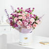 - Eucalyptus (2 Stems) - Roses Sweet Avalanche (12 Stems) - Spray Chresynthamum Mauve (3 Stems) - Alstromeria Purple (6 Stems) - Ruscus (8 Stems) - Sweet avalanche roses, purple alstroemeria, and mauve sprayed chrysanthemums come together in perfect harmony with lavender-sprayed eucalyptus. Lovingly wrapped in a lavender wrap and adorned with a purple tissue ribbon, this bouquet captures the essence of elegance.