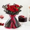 Nothing speaks of romance like roses and red velvet. This luxurious combo is crafted to captivate your special someone. A stunning bouquet of 12 velvety red roses, elegantly wrapped in black frosted sheets and hand-tied with a delicate red tissue ribbon, sets the tone for love. Complementing the floral beauty is a heart-shaped red velvet cake adorned with luscious strawberries, blueberries, and raspberries, a sweet symphony of flavours to celebrate your love. Gift this indulgence and make their heart skip a beat.