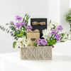basket, this arrangement features the freshest purple lisianthus, white alstroemeria, a cuboid gold pendant chain, and a wallet and card holder gift set. This anti-tarnish cuboid chain features a 3.5-cm pendant with a 16 inch chain plus a one inch extension, making it perfect for daily wear. The saffiano leather bi fold dark tan wallet and cardholder have a textured surface, which makes it look even more sophisticated. Personalize the pendant with his name and the wallet and card holder with his initial, making it special.