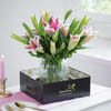 Gracefully marking fresh beginnings, this New Year gift pairs timeless floral beauty with refined simplicity. Pink oriental lilies bloom with soft fragrance and striking elegance, arranged in a ribbed glass vase that adds modern texture and charm. The gentle blush tones instantly uplift any space, making it a thoughtful gesture for homes, workspaces, or festive corners. Finished with a golden acrylic Happy New Year tag, this arrangement feels calm yet celebratory. Ideal for expressing warm wishes, positivity, and optimism, it offers a lasting visual reminder of new goals, hope, and graceful moments ahead.