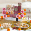 Radiant Rituals blends Sweet Avalanche roses, marigolds, and pink carnations, accented by golden-sprayed springery and Kamini in rose gold vessels. Paired with Lily of the Valley incense and Tuberose Jasmine diffusers, handcrafted truffles, baklava, flavored nuts, and a money plant complete this luxurious Diwali tribute.
