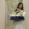 Where tradition meets royalty. White roses and fragrant tuberoses symbolize purity, with gold-sprayed waterlilies adding a divine shimmer. The blue velvet box and gold pearl strings evoke royal grandeur. A brass diya illuminates black pepper cashews, salted almonds, almond brittle, and nutty nibbles; a Diwali feast fit for kings.