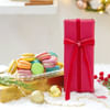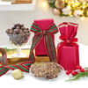 A sumptuous bouquet featuring marigolds, cypresses, and Kamini adorned with gold pine cones, a balloon dog ornament, and a golden Christmas tree. Wrapped in elegance with red ribbon bows and holiday-themed accessories, it includes a medium panel tray filled with delights like Sorrentina truffle chips, plum cake, almond brittle chocolates in a wooden box, a Biscoff jar cake, assorted macaroons in a decorative box, and red wrapping sheets.