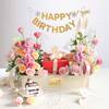 An elegant blend of blooms and indulgence, this floral and dessert hamper is crafted to make birthdays truly unforgettable. Soft pink, peach, and mauve flowers come together in a refined arrangement, accented with satin ribbons, a graceful Happy Birthday banner and finished with a decadent cake. It is a perfect choice for elevated birthday gifting. - Total No. of Stems: 28 - Sweet avalanche roses, Peach roses, Mauve chrysanthemum, Gypsophila, Pink lisianthus - Chocolate oreo cake 500 gms - Happy Birthday banner - Tray, Off-white - Product Dimensions: - Height: 46 cm / 18 inches - Width: 58.5 cm / 23 inches