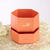 Celebrate sweet rakhi traditions with Hermosa roses, gold-sprayed peonies and leatherfern wrapped in pink frost film, finished with gold baubles and a pearl accent. An orange hexagon drawer box holds a beaded kundan and pearl turquoise rakhi set for Bhaiya and Bhabhi, and a roli chawal leaf plate. A box of baklawa, roasted almonds tied with a pearl-edged bow, and a floral pouch of peri peri almonds and black pepper cashews complete this rakhi hamper, perfect for gifting and same day rakhi delivery.