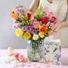 Woven with electric yellows and deep cerise, this arrangement captures the pulse of a fresh garden morning in a sophisticated glass vase.It's a zesty, light-catching tribute to the mom who brings a vivid energy to every room she enters. - Total no. of Stems: 23 - Yellow Rose, Cerise Pink Rose, Yellow Carnation, Anna Karina Rose, Orange Asiatic Lilly, Mauve Chrysanthemum, Pink Spray Carnation,Solidago - To My Dearest Mom Greeting Card - Ribbed Vase, Glass - Dimensions: - Height: 51 cm / 20 inches - Width: 42 cm / 16.5 inches
